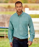 55% combed cotton/45% polyester • 4 oz. • washed chambray look • soft hand • easy-care • wrinkle-resistant • stain- and soil-repellent • double-needle stitching • 2 patch pockets on chest • Sizes: S-3XL