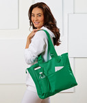 600-denier polyester • fabric contains 50% recycled material • zippered main compartment • contoured main front pocket with grommets • 8" x 9" zippered inside hanging pocket • gusseted front side-pocket • adjustable handles • plastic accessory hanging ring • pen loops • color-matched hardware • 5"w x 8"h approx. imprint area • 4" diameter max. embroidery area • Sizes: 15"w x 13"h x 4"d